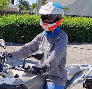My new Schuberth E1 helmet in Cut Blue fit beautifully and is nice, vivid, and visible. And the sun visor offered excellent protection against the super bright sunshine. Plus, my boyfriend , Bill, noticed that the white peak on the helmet matched beautifully with the white peaked fender on the front of the bike. And, in case you were wondering, my only other motorcycle specific equipment right now is the Rev’it Valley Tube necktube that does a fantastic job of keeping my neck from getting sunburned. I do have a pair of Klim XC Lite Women’s Gloves to wear for my summer practice on order and will have them in time for my next weekend practice. As far as clothing, I’m just in jeans and a long-sleeve t-shirt while I let my boyfriend select and, more importantly, pay for some great warm weather riding gear.