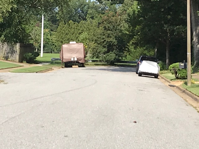 I am also looking forward to the autumn weather. Today the high hit 93 with a heat index of 104 and, even though we ride in the morning, the temperature was already at 88. I could feel my wet t-shirt under my jacket plastering itself to my skin as I worked on the slalom and my fast breaking. The trailer was still parked in front of the Armco, so I was having to make pretty tight U-turns again. I worked on entering the slalom in second gear at about 11 mph even though I had to quickly slow and shift down to execute the U-turn. Most of them went well, though I had a bobber where I had to put my left foot down, and one time, I didn’t turn quickly enough and almost ran into a crepe myrtle. On that goof, I rolled on the throttle, so Bill gave me a caution to check myself riding in this heat. When I got overly warm, I cruised half the neighborhood, getting a lovely, cooling breeze at 25 mph.
