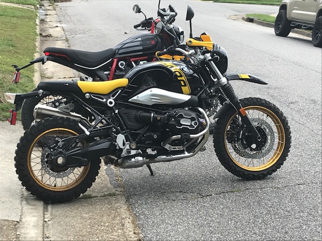 We also worked on straightening up and coming to a stop from a curve, something we hadn’t really worked on since the MSF class. The best parts of the ride were when we rode with some speed to create a cool breeze; the Ducati engine is a lot warmer than the BMW 310. Overall, I had a great ride, easily found neutral every time, then I almost dropped the bike at the end of the ride. As I shifted into neutral and cut the bike off, I noted the fuel light was on; I began to lean the bike to the left to dismount when I realized I didn’t have the kickstand down.  The worst part is that to the left was the R Nine T, so had I dropped the bike, it would’ve landed on Bill’s with me sandwiched in the middle.  Since my one drop of the Ducati was from getting off the bike without ensuring the kickstand was down, I clearly have an issue.  Bill suggested I recite an “end of the ride” checklist to help me fix this problem.
