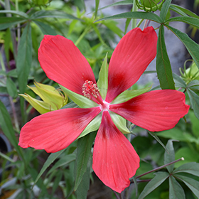 One flower I have seen in gorgeous bloom but keep forgetting to mention is the hibiscus. There is a tall stand in someone’s yard—six to seven feet in height–of the scarlet rose mallow swamp hibiscus. And then there is a smaller, four-foot bloom down by the river, planted by the birds. It’s funny but most people associate the hibiscus with Hawaii, but there is a native varietal to Virginia—I have the Eastern rose mallow variety in my yard.