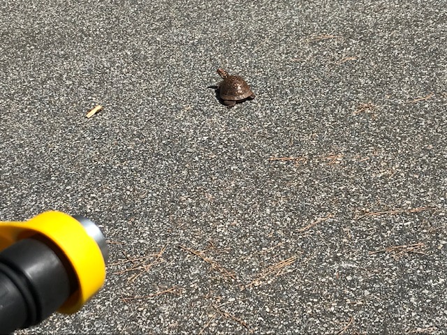 It was hot, near 90 degrees, so I spent most of the ride cruising with just turns in courts. Because last week’s middle of the street U-turn didn’t go well, I did try that. The first one was a disaster—into the grass, but the second one was a success. I again encountered a small box turtle working his way across the court. He stopped when I did and stared me down, so I rode off and left him to it. Soon after I spotted what I think was a Great Purple Hairstreak butterfly but may have been a small Black Swallowtail whose yellow markings have not come in. And I finally did spot a Sulphur recognizing the bright yellow as I rode closer to it. Before my ride ended, one little Cabbage White made an appearance as did a smaller Tiger Swallowtail.